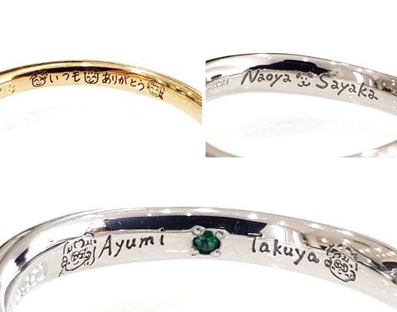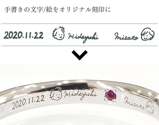 文字だけではなく絵などを加え、世界でたったひとつのブライダルリングができあがります。